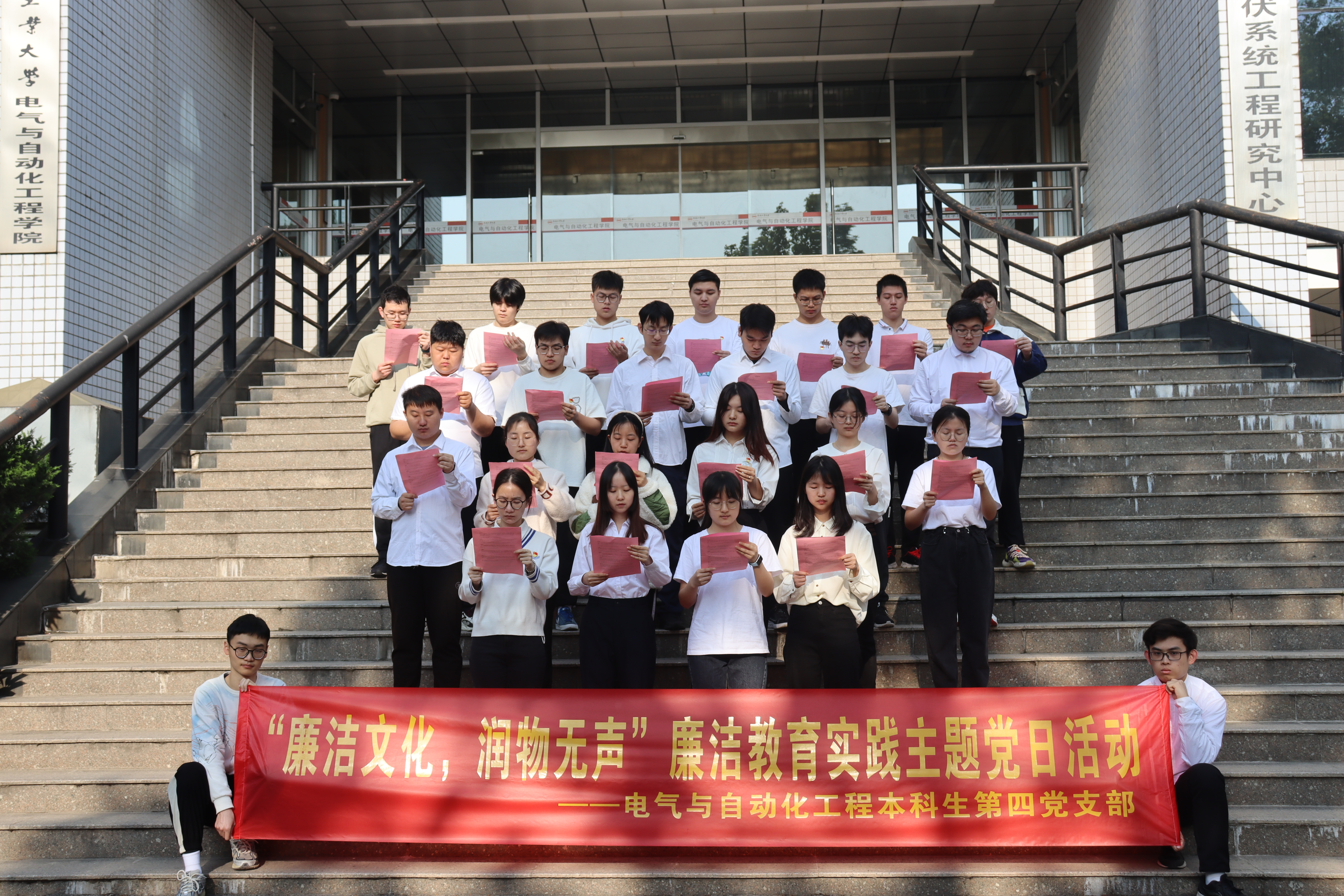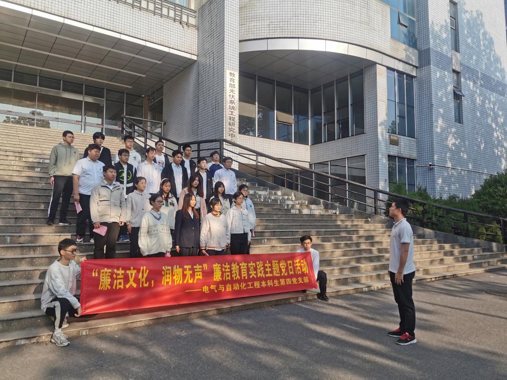 4月26日清晨,bwin必赢国际中国官方网站本科生第四党支部全体党员在逸夫楼前开展“廉洁文化,润物无声”廉洁教育实践主题党日活动。