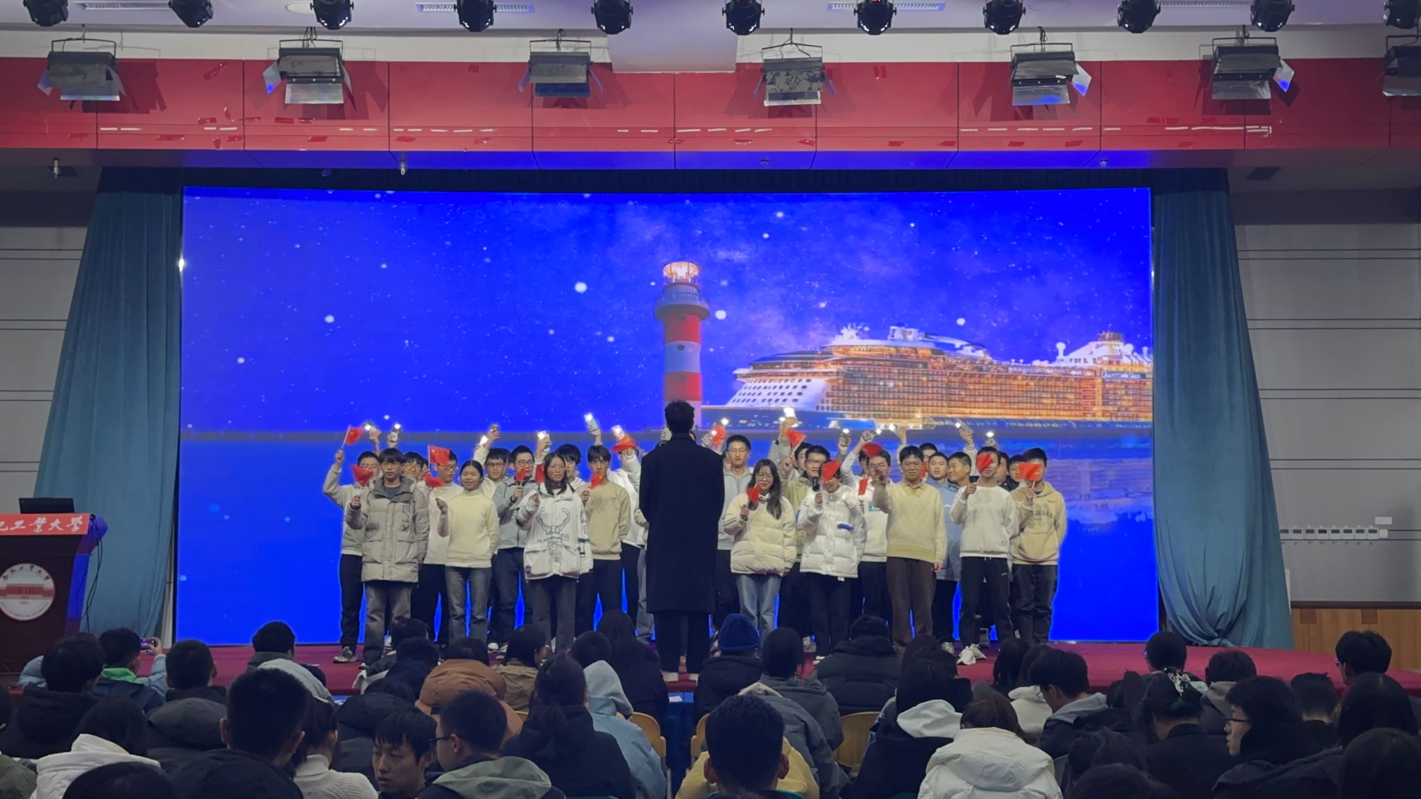 在第二篇章中,自动化23-2班的表演《少年中国说》通过合唱、朗诵、太极表演的形式歌颂青春朝气蓬勃、积极进取的清澈模样。自动化23-3班表演的舞台剧《一根红线系三代》通过交错时空深入挖掘人物内心世界,展现了革命崇高品质和伟大精神。合唱《灯火里的中国》展现祖国的胸怀辽阔、山河壮丽,抒发了自动化23-4班全体同学的咏国之心、爱国之怀、报国之志。机器人23-1班表演歌曲《山河图,丝绸》《十年人间》,朗诵《山高路远》将现代艺术与古典艺术形式相融,为观众呈现一场火热的视听盛宴。
