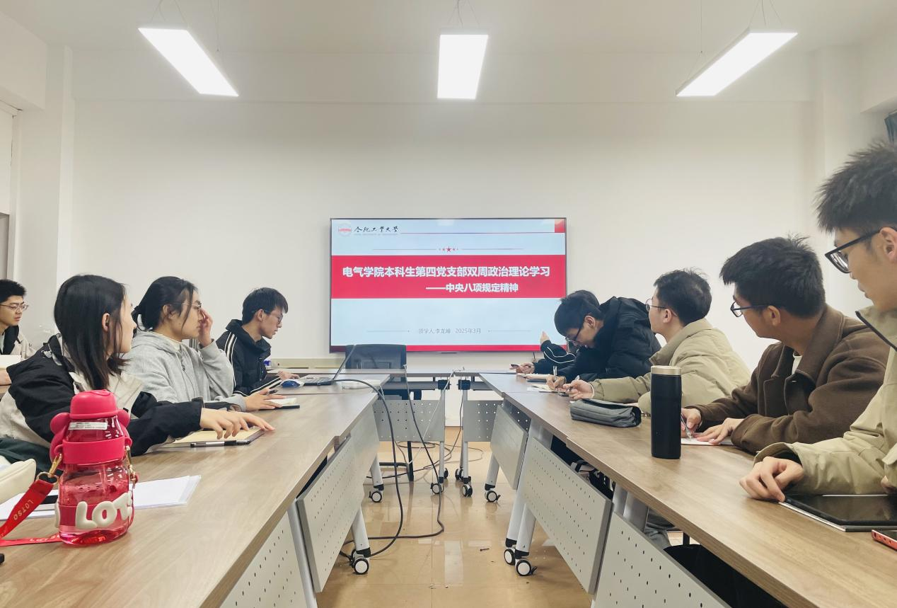 3月26日下午,bwin必赢国际中国官方网站本科生第四党支部在逸夫楼1008会议室开展“以中央八项规定精神为引领,走好作风建设新的长征路”专题党课,支部全体党员参加活动。